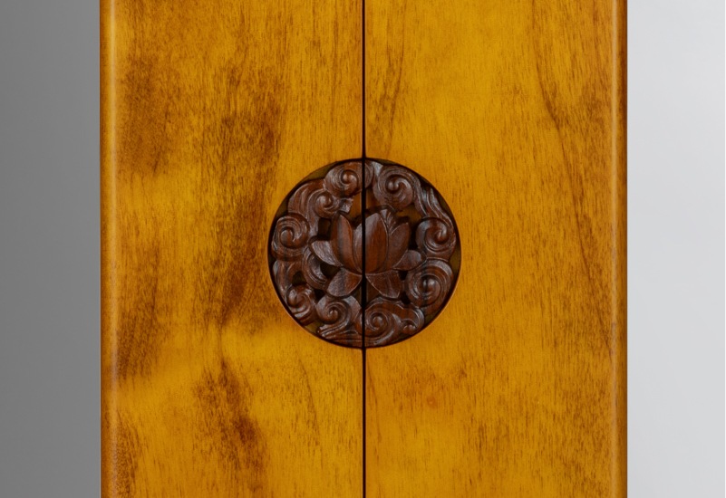 扉の取っ手部分には彫刻で吉祥文様である霊芝雲(れいしぐも)と、清らかな蓮華をあしらいました。